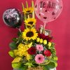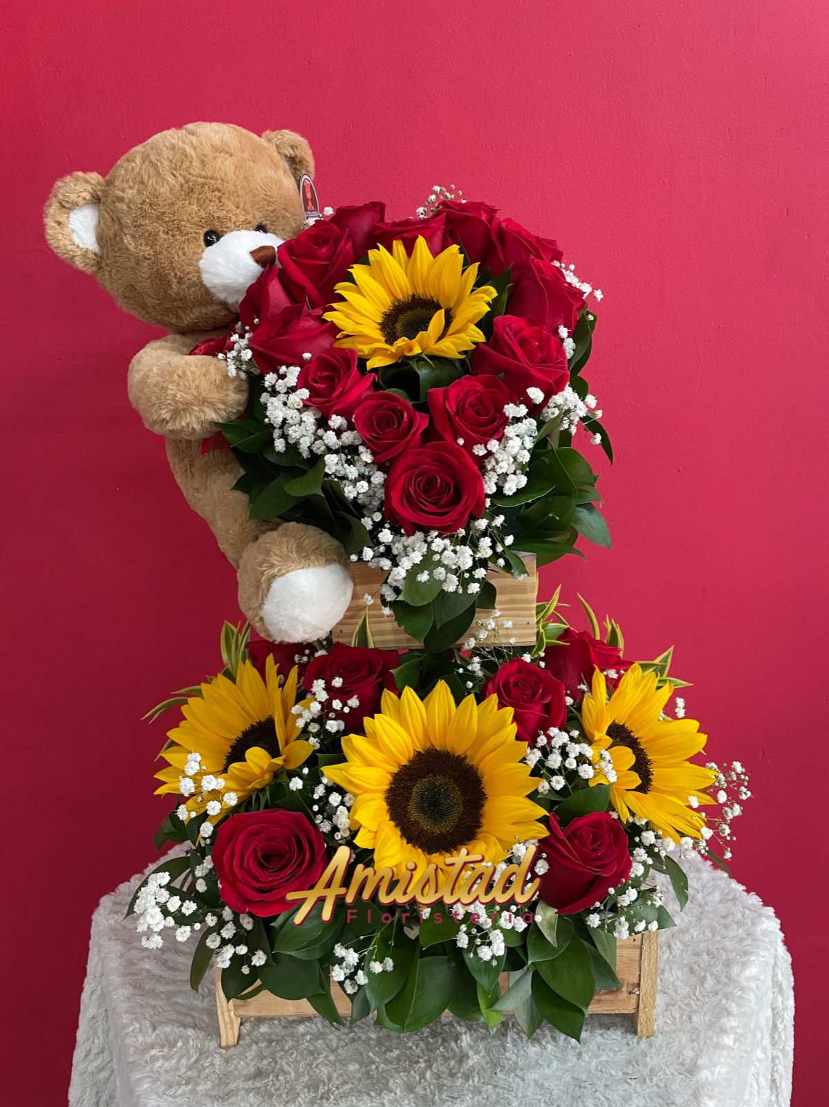 Arreglo con 21 rosas y 4 girasoles; acompañado de 1 peluche mediano.