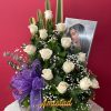 Arreglo floral elaborado con 6 lirios, follajes, complemento y moño. Acompañado de sufragio.
