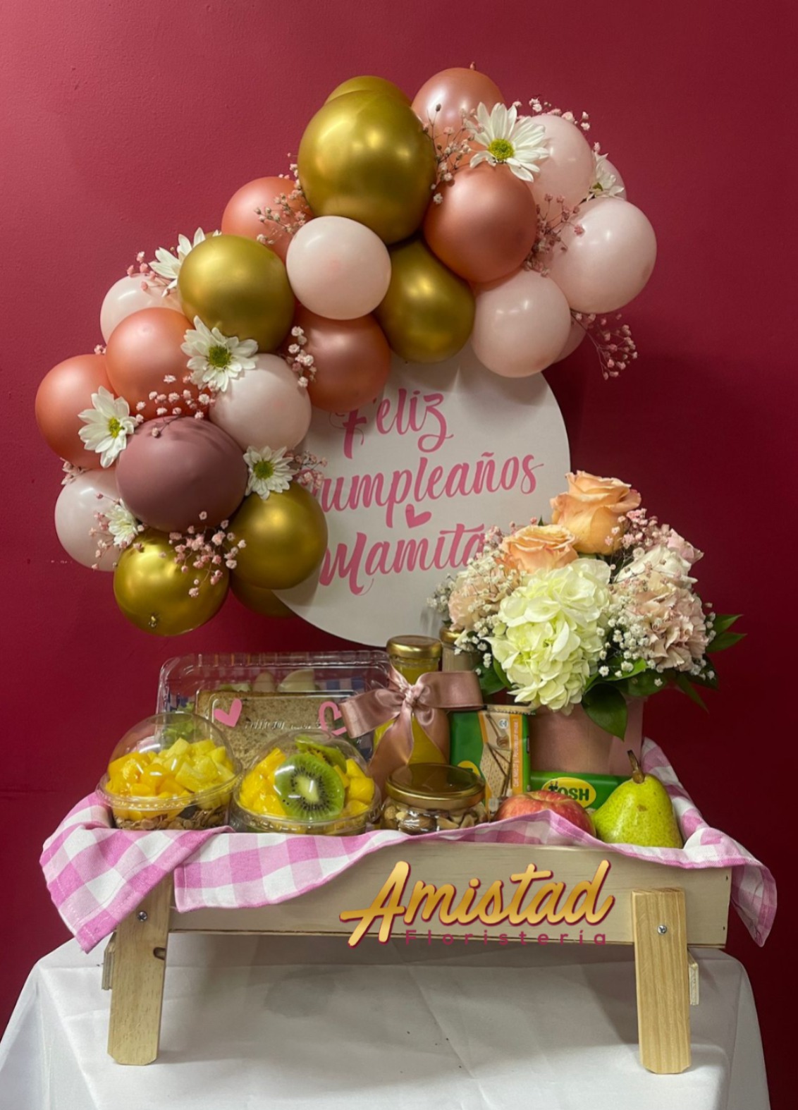 Desayuno sorpresa decorado con arco de globos y blonda personalizada. Acompañado de tocado con flores variadas, sanduche, jugo, milo, frutos secos, parfait, fruta picada y entera y galletas integrales.