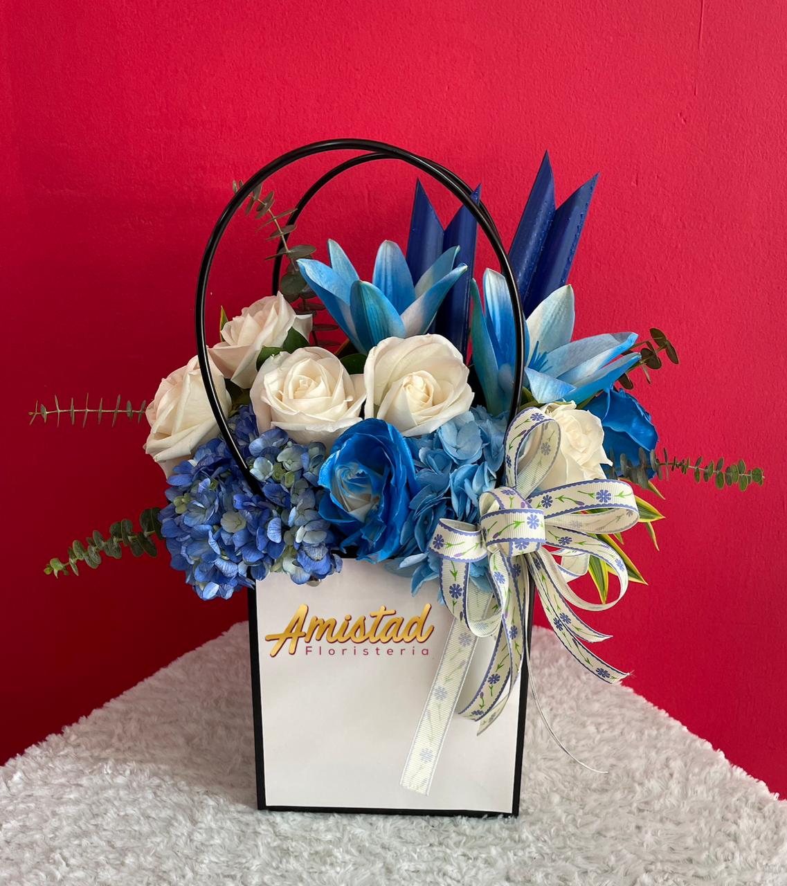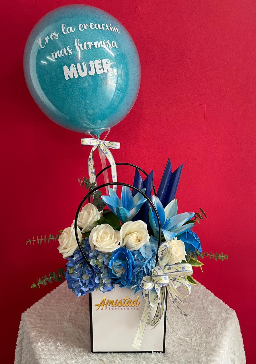 Cartera con 7 rosas, 2 hortensias, 1 lirio, follajes y complementos. Acompañado de globo personalizado.
