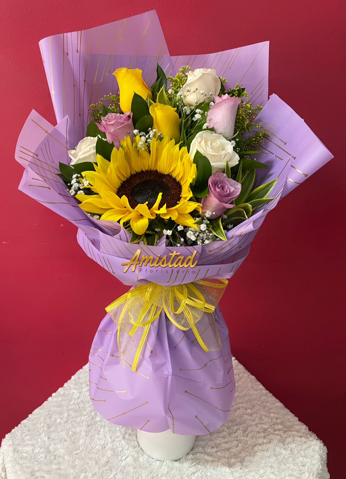Bouquet con 8 rosas, 1 girasol, follajes y complementos.