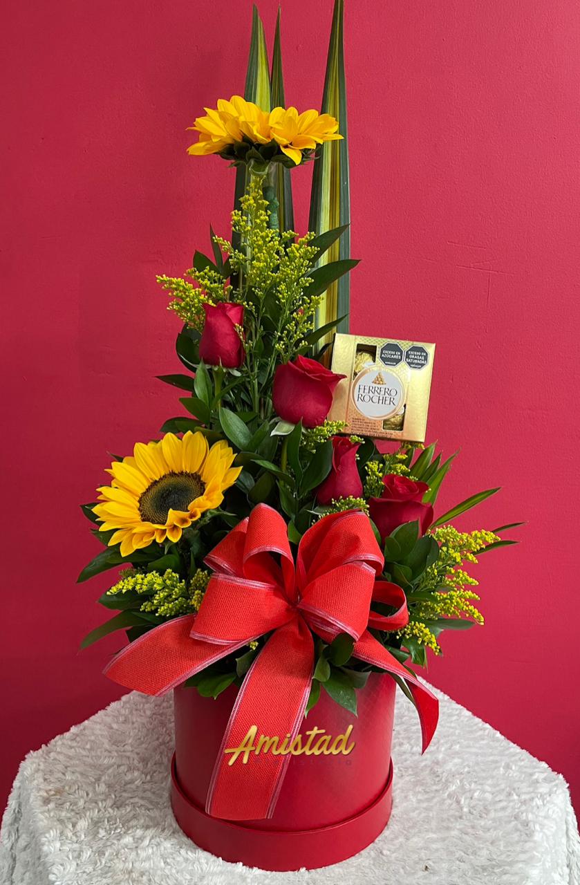 Caja decorativa con 4 rosas, 3 lirios, follajes y complementos. Acompañado de ferreros x4.