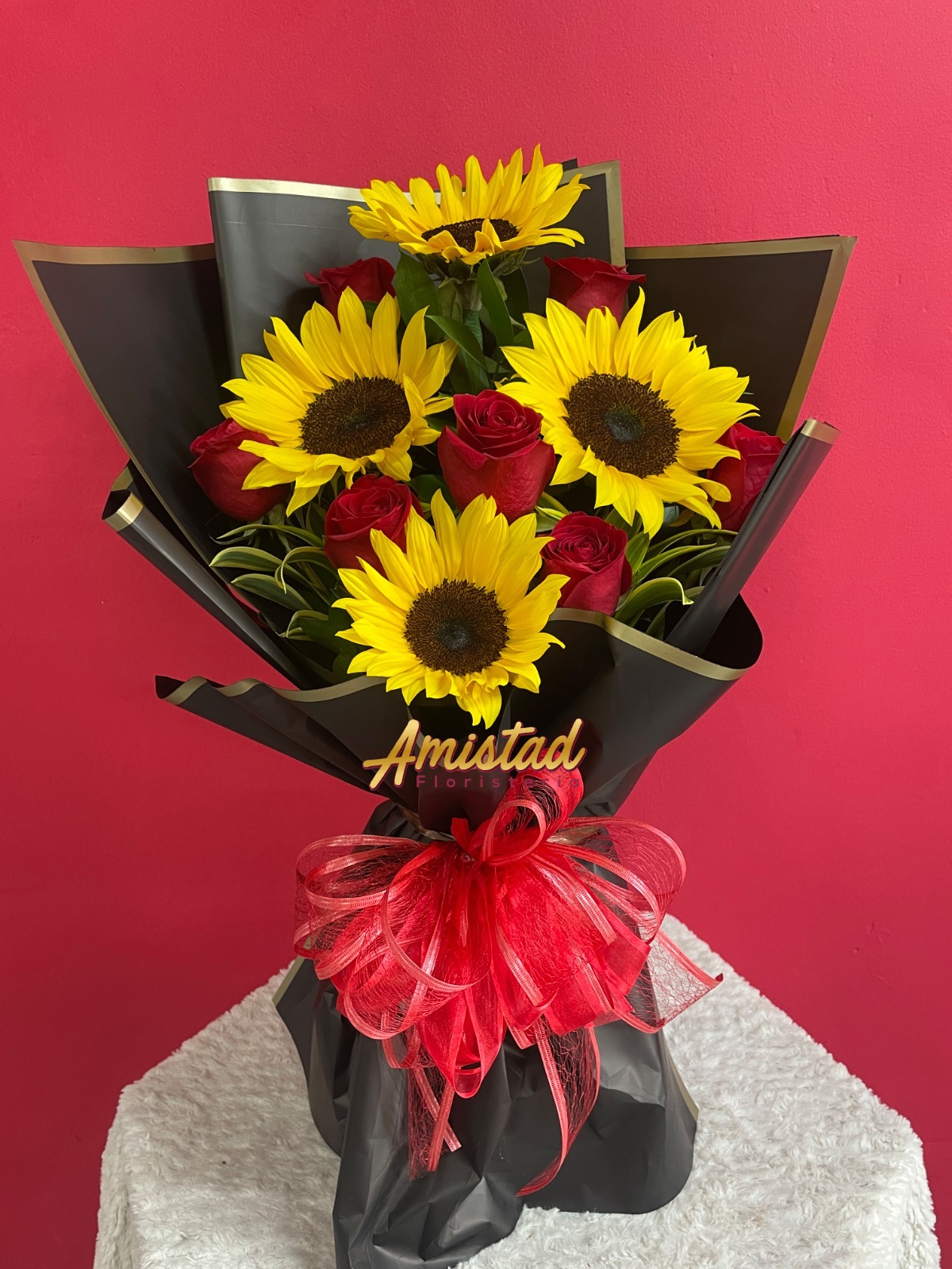 Bouquet con 4 girasoles, 8 rosas, follajes y complementos.